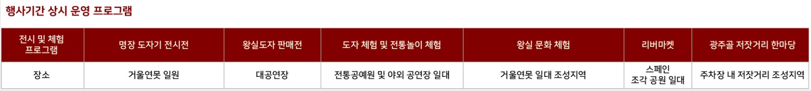 프로그램: 도자기전시/왕실도자 판매전/체험행사/공연 및 부대행사