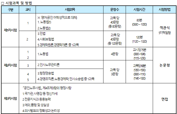 - 1차 시험: 노동법, 민법, 사회보험법, 경영학(원론, 경영학 개론 중 선택), 영어(공인 영어능력시험으로 대체 가능)