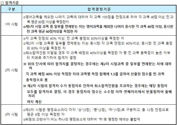 - 1차 시험: 영어 과목을 제외한 나머지 과목에 대해 각 과목 40점 이상, 전 과목 평균 60점 이상.