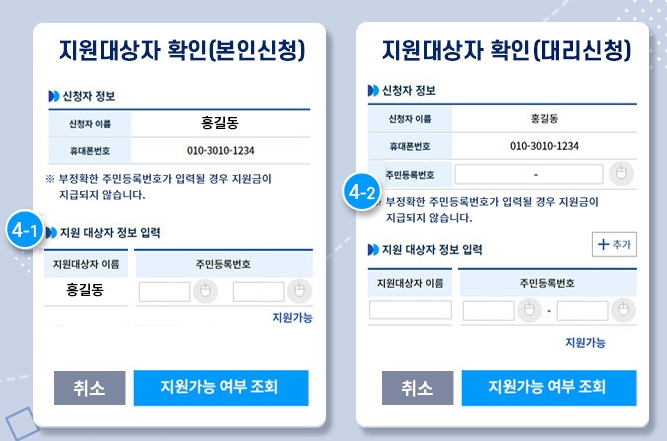 4-1 본인신청시 지원대상자 정보를 입력한 후 '지원가능 여부 조회' 를 클릭하여, '지원가능' 으로 조회되는지 확인합니다. (정보를 잘못 입력했거나, 지원대상자가 아닌 경우 '지원불가능'으로 조회되므로신청 시 유의 바랍니다.)