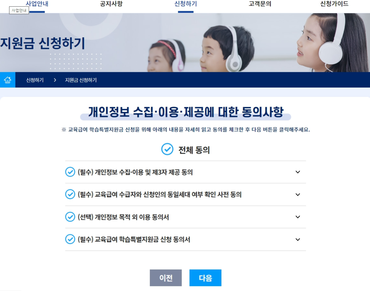 개인정보 수집, 이용, 제공에 대한 동의사항 페이지 나오네요. 교육급여 학습특별지원금 신청을 위해 아래의 내용을 자세히읽고 동의를 체크한 후 다음 버튼을 클릭해주세요.