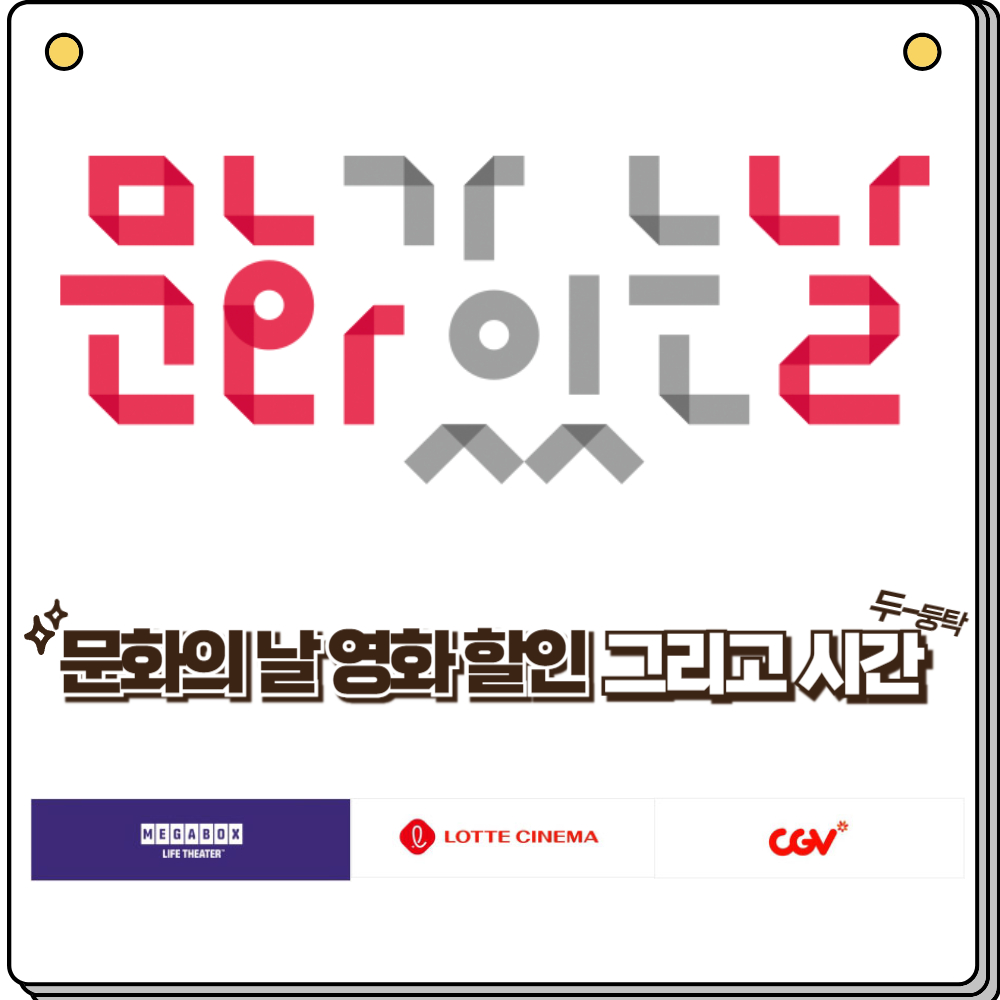문화의 날 영화할인 예매를 알아보려 합니다. 달력에 표시되지 않는 매달 마지막주 수요일은 '문화의 날!' 인걸 알고 계시죠? CGV, 메가박스, 롯데시네마 각각의 시간을 알아보고자 합니다. 영화뿐 아니라 전시 · 공연 관람료 또한 할인(추진 상황에 따라 혜택이 상이)을 확인할 수 있습니다.