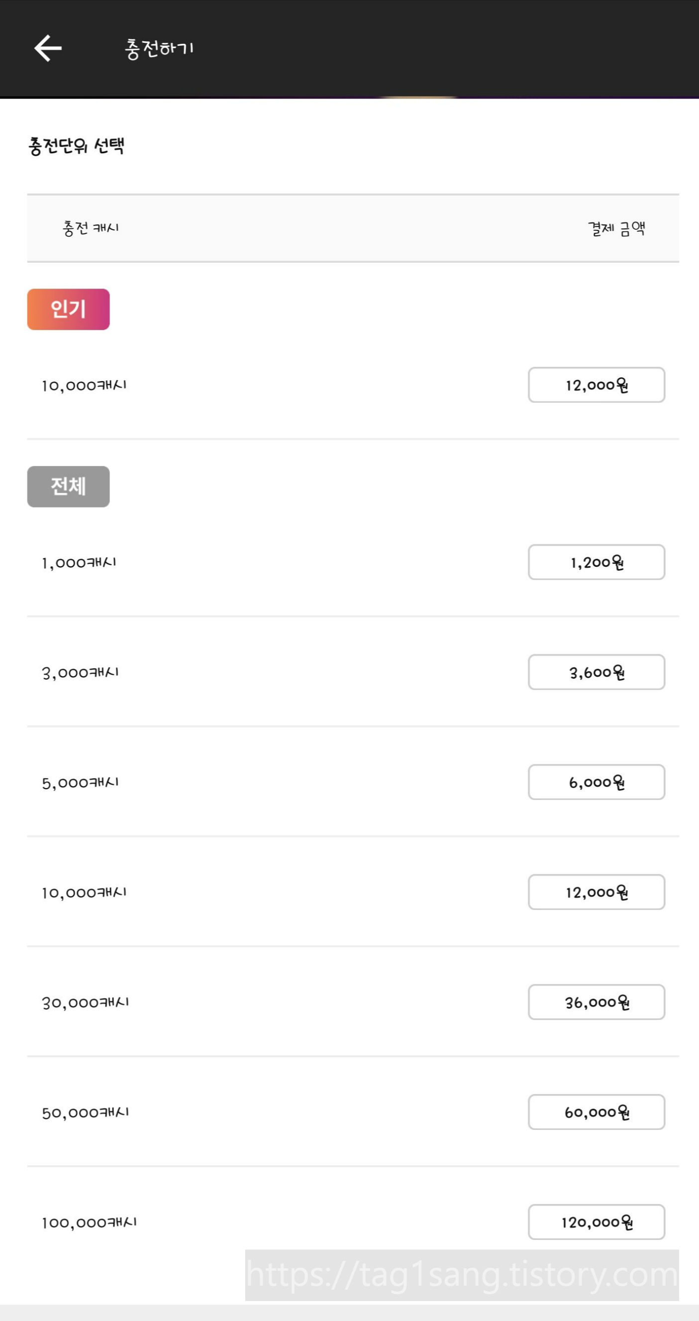 카카오페이지 앱에서 캐시 충전을 하려고 하니