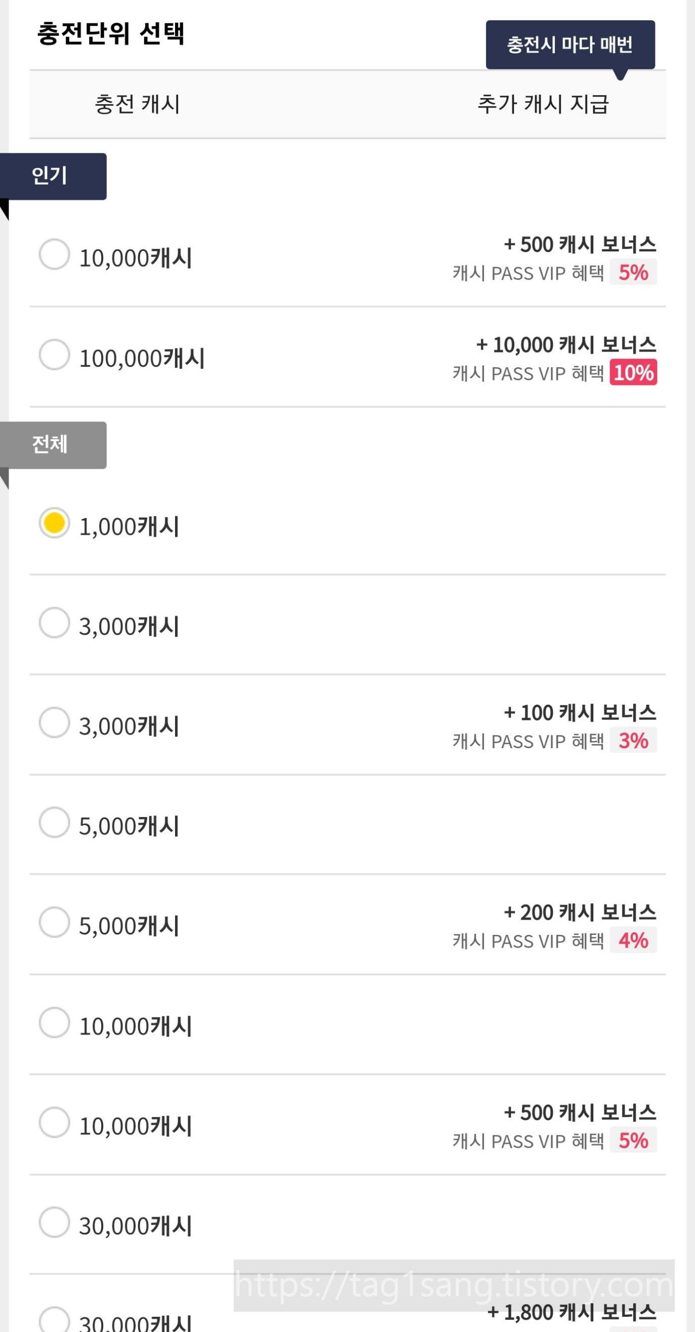 '+OOO캐시 보너스'는 자동충전이니 원하시는 걸로 선택하면 되세요~