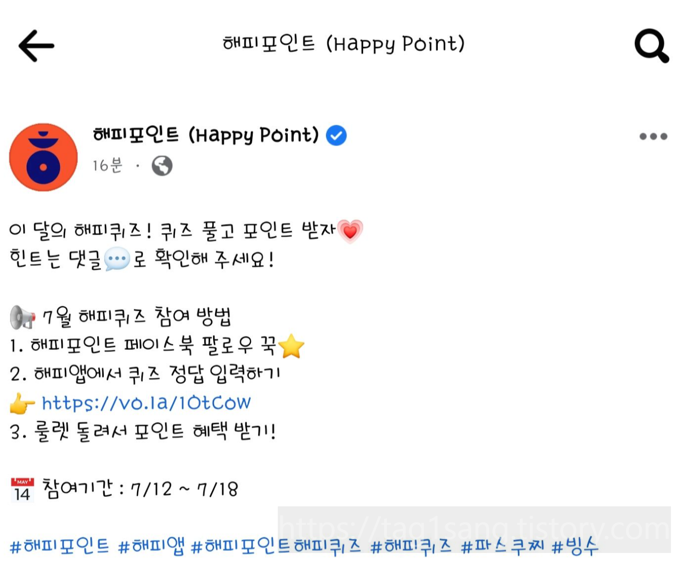 7월 해피포인트의 두번째 해피퀴즈가 오픈됐어요~~