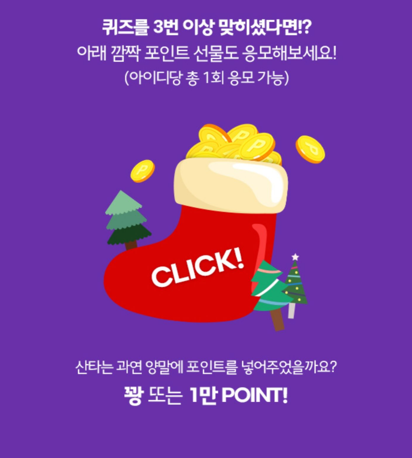 퀴즈를 3번 이상 맞혀야 산타 양말을 클릭할 수 있어요.
